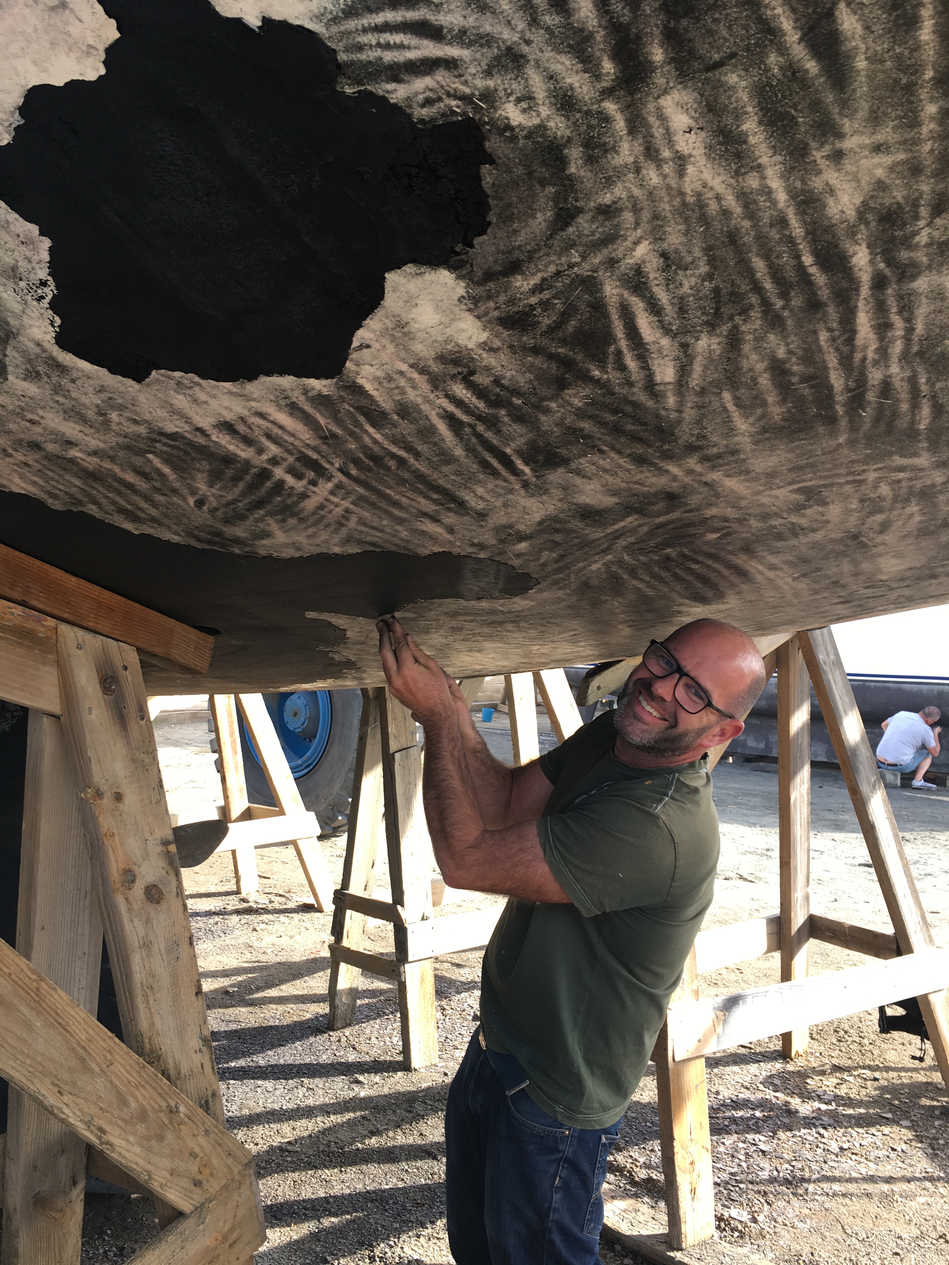 David started scraping the 24 years old antifouling of the hull, just to see if it came off, and yes it did. I can tell you, if you meet Sam sanding away on his hull, you are very happy if your antifouling comes off by just scraping. A lot less dirty. In the meantime there are some decisions to be made, one of them is, are we going for ‘copper coat’ or not. Copper coat is a combination of a specially developed solvent-free epoxy resin and high purity (99%) copper, but expensive. It has a proven lifespan of 10 years plus, so no more lifting and re-painting the boat each year. After a few phone calls with one of the founders of this company David ordered the whole lot. Done. Next decision to be made is to put an osmosis treatment before the copper coat. The hull is in an immaculate condition after all those years and after some deliberation the answer was ‘no’.