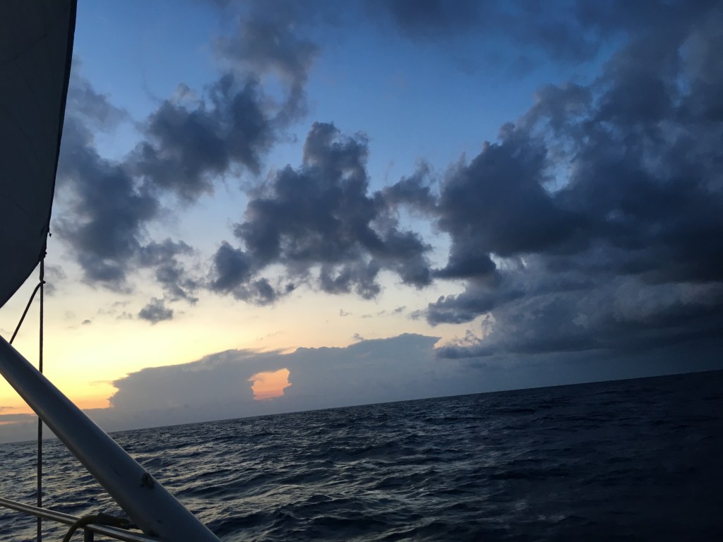 The next day we left late afternoon to cross back to Menorca. A 250 nm passage and with only 25 liters of water left we thought, “better a shower less than missing this good weather window”. We had some great sailing again. Very nice wind and very good progress. We were about to get close to Menorca when I had my night watch. While having my night watch I had seen thunder for a while in the far distance, but now it looked like it was coming closer and closer to us. I decided to wake up David, when it was 2’ o’clock at night.