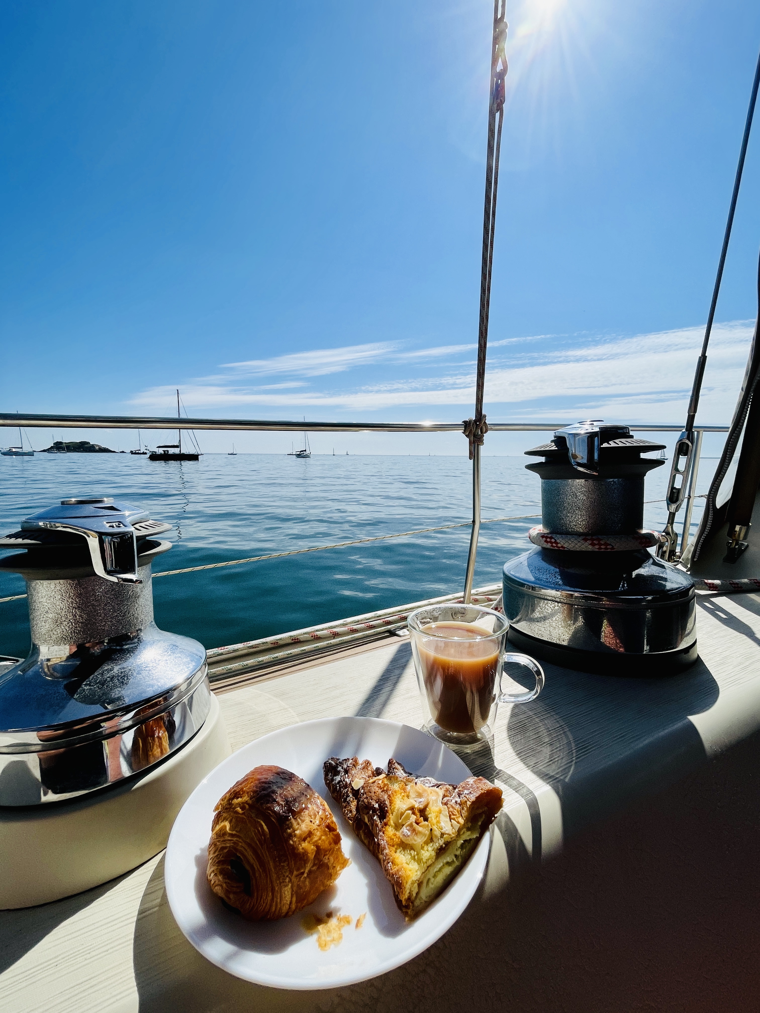 At the beginning of May we were finally able to leave, and so we did straight away. We wanted to make big passages as we already sailed this part of France before. We sailed from Ouistreham to Cherbourg and Cherbourg to the Glenan Islands. That’s were we decided to enjoy these beautiful islands a bit more. There are also described as the ‘Breton Taihiti’ and it indeed felt like I was back in the Caribbean. Lovely blue waters, supping and strolling around the islands, postcard perfect. We even had our first barbecue of the year here. After the Glenan Islands we sailed to our favourite island, called “Houat”! A stunner of a place with one of the best ‘Pain au raisins’ we ever had. I can tell you, I had quite a few in my life, you can wake me up for them!